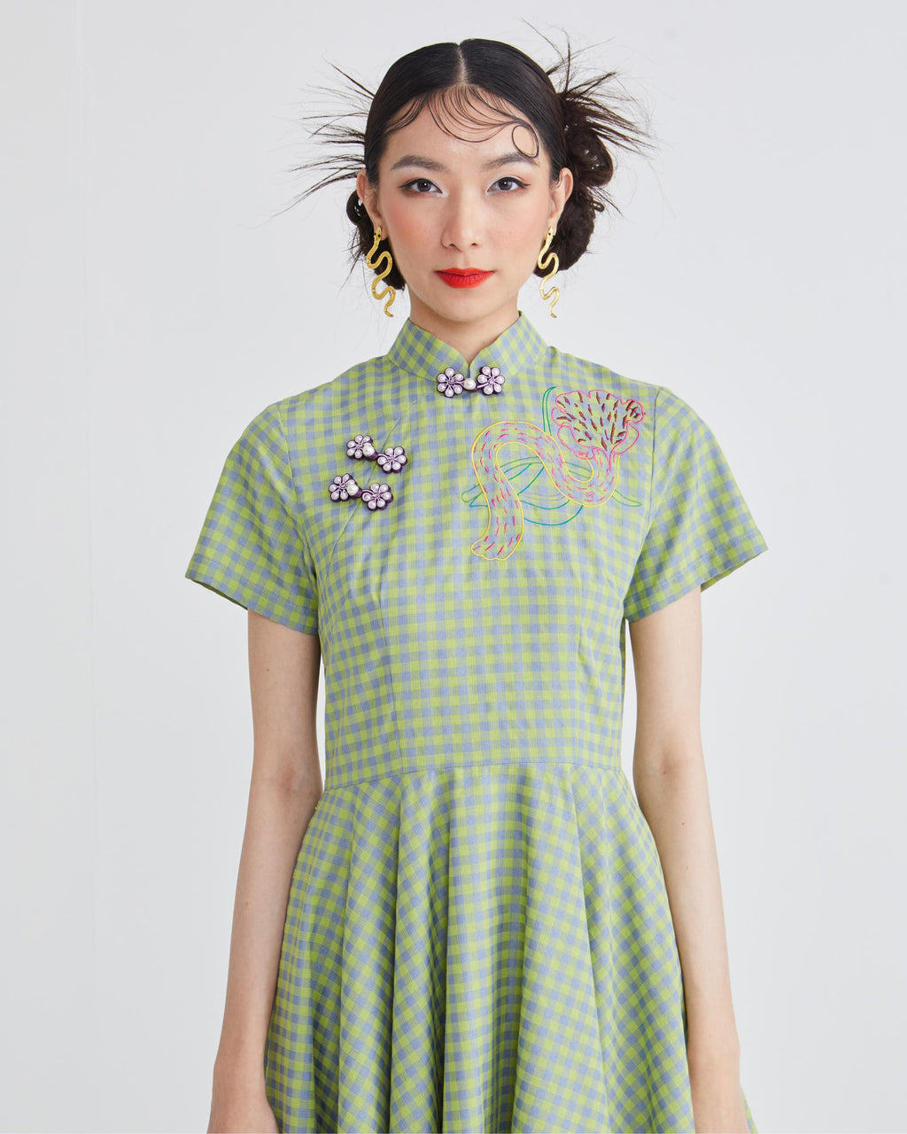- Decorative frog buttons at the front